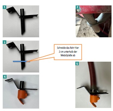 Das Stahlteil mit dem Streuer wieder an der Sämaschine anbringen, wobei der Streuer nach hinten zeigen muss. Den Zufuhrschlauch für das Mikrogranulat wieder anschließen.
